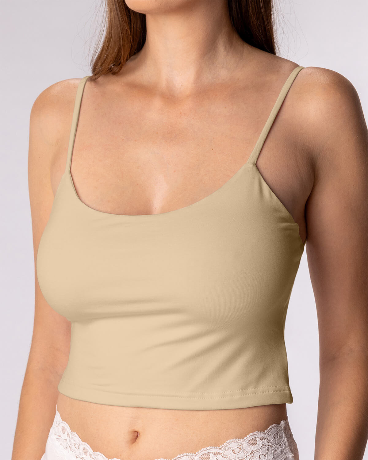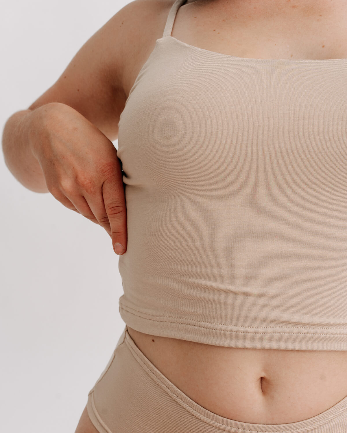 Úzká ramínka a kulatý výstřih podtrhnou tvoji přirozenou ženskost, aniž by rušily. A protože je z bambusu, můžeš se spolehnout na celodenní komfort – croptop dýchá s tebou, odvádí vlhkost a je jemné i k té nejcitlivější pokožce.